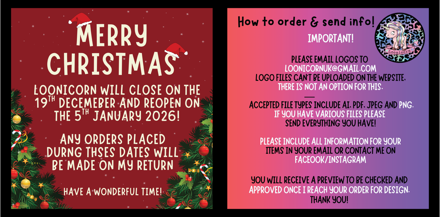 Please email all Logos/Images and any information you would like on your order item to loonicornuk@gmail.com